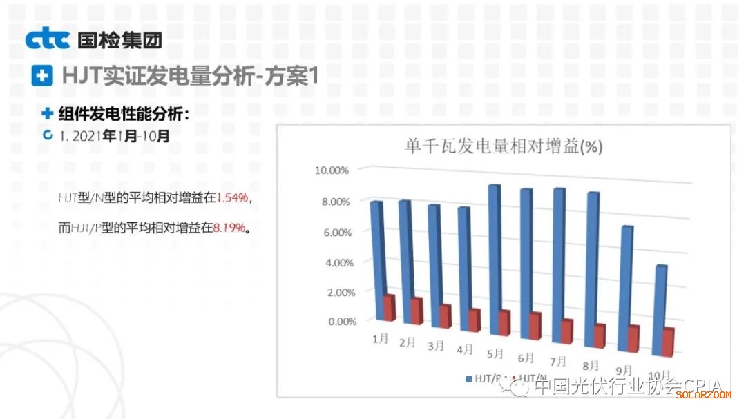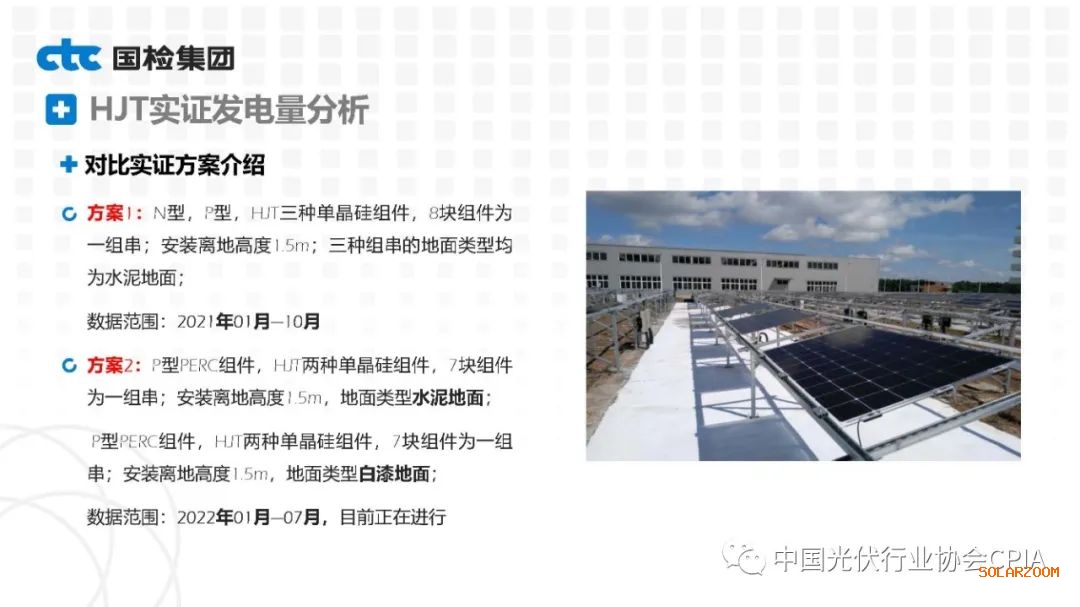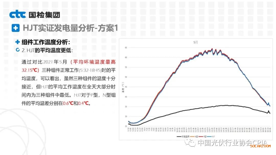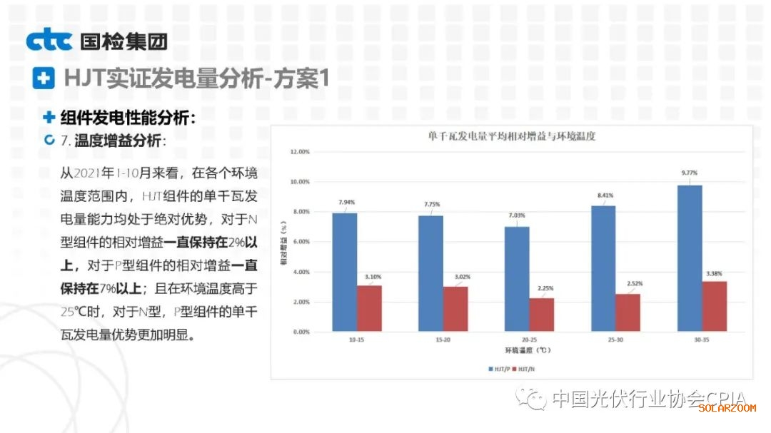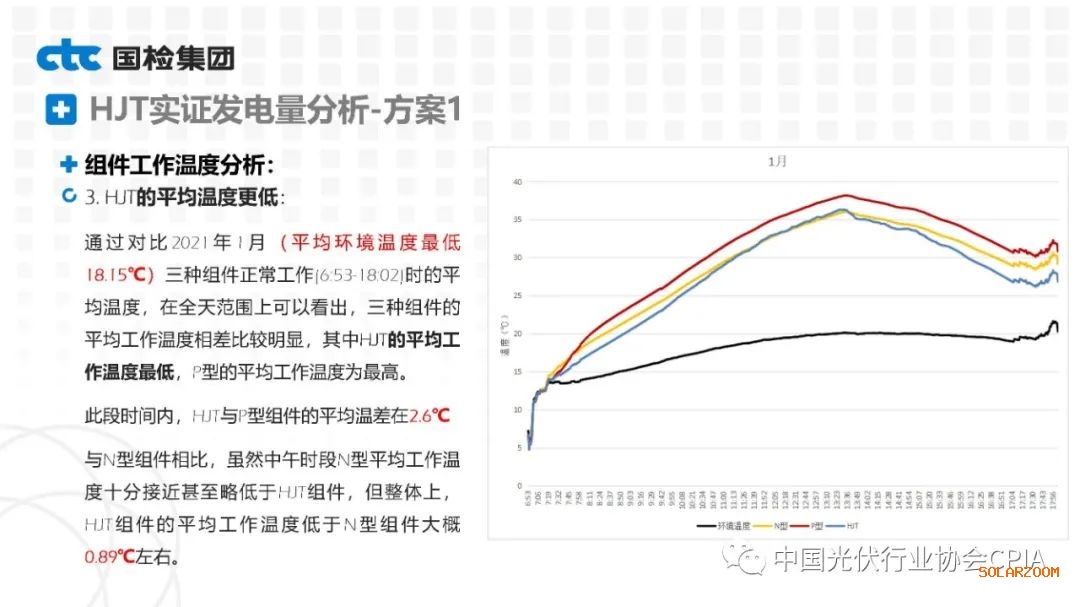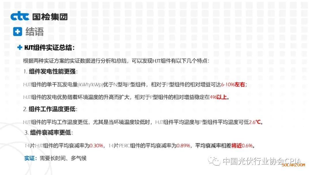 2022年8月31日下午,由中國(guó)光伏行業(yè)協(xié)會(huì)主辦的CPIA熱點(diǎn)問題系列線上研討會(huì)第八期——異質(zhì)結(jié)技術(shù)與產(chǎn)業(yè)發(fā)展論壇通過網(wǎng)絡(luò)直播形式順利召開。國(guó)檢集團(tuán)國(guó)家太陽能光伏(電)產(chǎn)品質(zhì)量檢驗(yàn)檢測(cè)中心主任王冬作異質(zhì)結(jié)組件戶外實(shí)證性能比對(duì)分析。王主任表示,根據(jù)不同實(shí)證方案實(shí)證數(shù)據(jù)分析可以看出,HJT組件發(fā)電性能更強(qiáng),工作溫度更低,衰臧率更低。