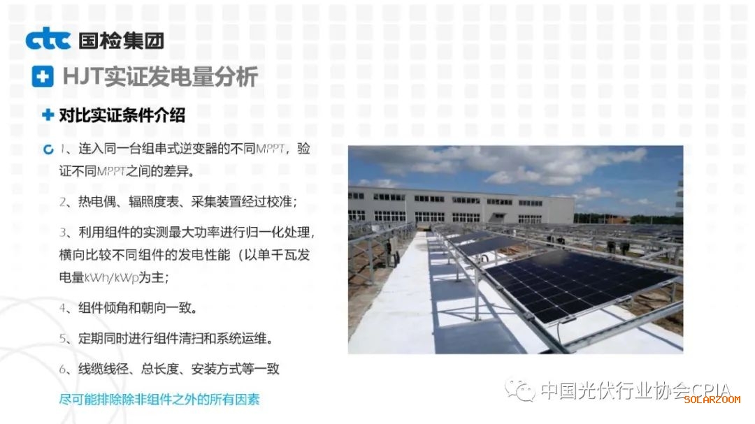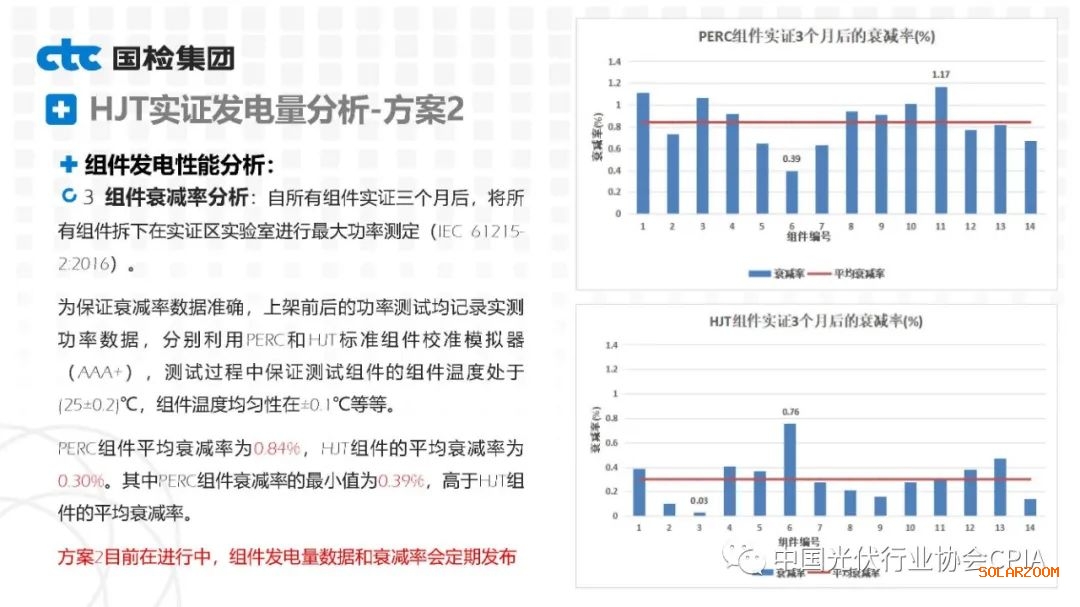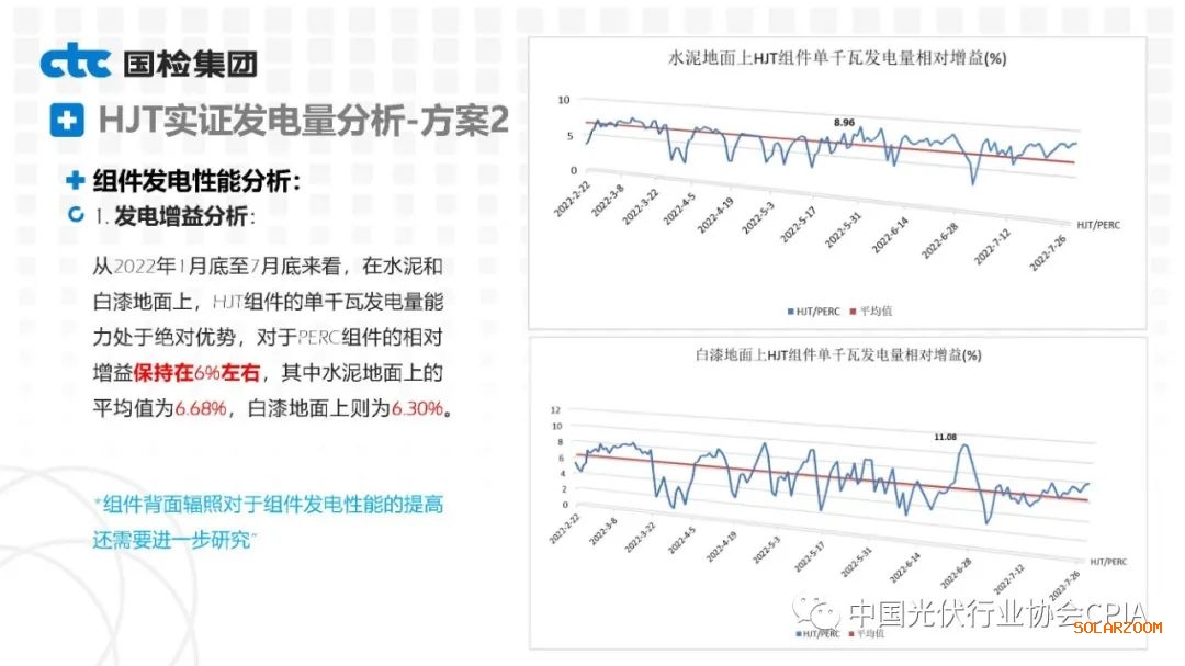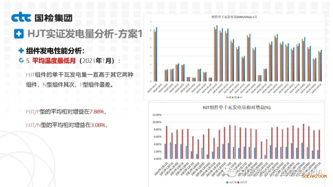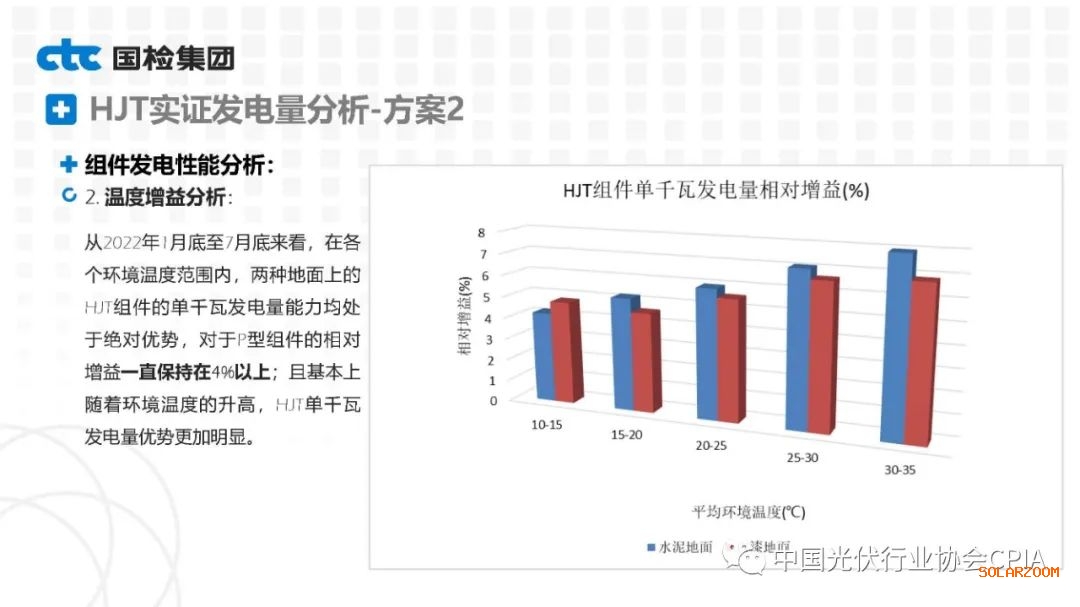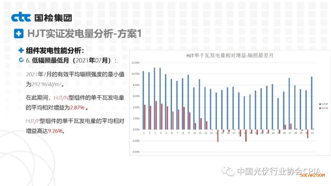 2022年8月31日下午,由中國(guó)光伏行業(yè)協(xié)會(huì)主辦的CPIA熱點(diǎn)問題系列線上研討會(huì)第八期——異質(zhì)結(jié)技術(shù)與產(chǎn)業(yè)發(fā)展論壇通過網(wǎng)絡(luò)直播形式順利召開。國(guó)檢集團(tuán)國(guó)家太陽能光伏(電)產(chǎn)品質(zhì)量檢驗(yàn)檢測(cè)中心主任王冬作異質(zhì)結(jié)組件戶外實(shí)證性能比對(duì)分析。王主任表示,根據(jù)不同實(shí)證方案實(shí)證數(shù)據(jù)分析可以看出,HJT組件發(fā)電性能更強(qiáng),工作溫度更低,衰臧率更低。