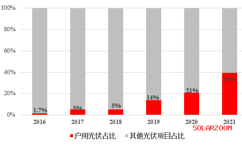 戶用光伏在光伏年新增裝機(jī)中的占比,也逐年提高;2021年一度還在那到39%!具體如下圖所示。
