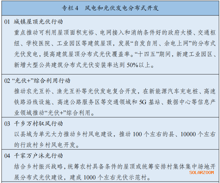 在“十四五”規(guī)劃中,重點(diǎn)提及了“光伏+”和“千鄉(xiāng)萬戶沐光行動”,如下圖所示。而這兩個發(fā)展方向,均與農(nóng)民利益相關(guān)。