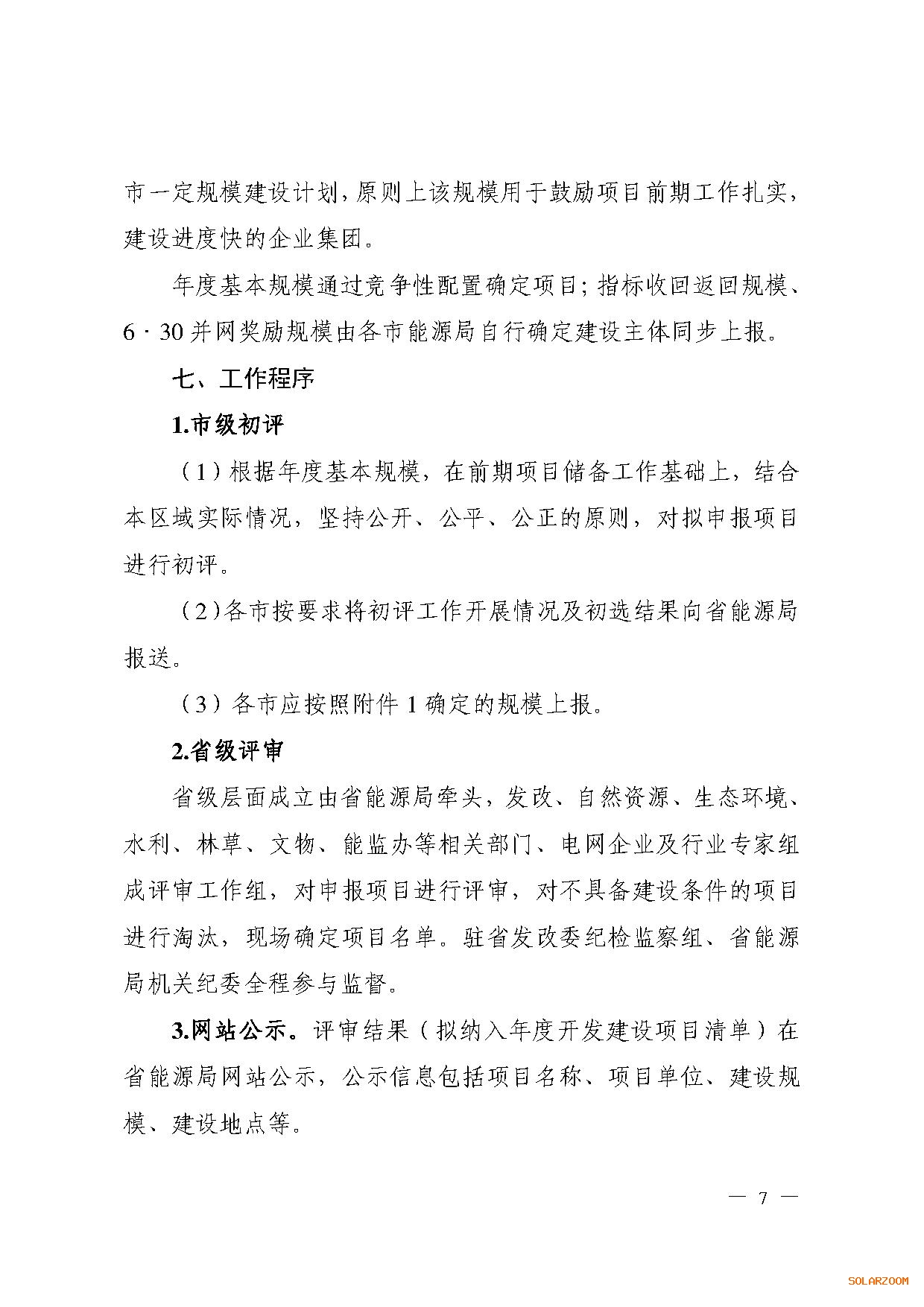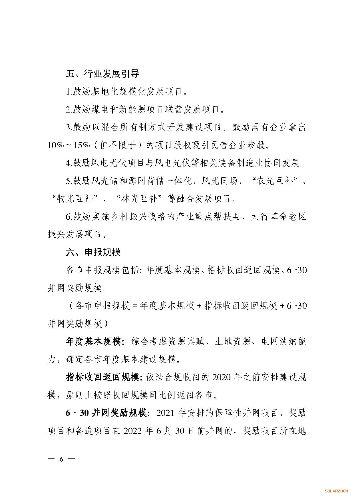 各市申報規(guī)模包括:年度基本規(guī)模、指標收回返回規(guī)模、6·30 并網獎勵規(guī)模。 (各市申報規(guī)模=年度基本規(guī)模+指標收回返回規(guī)模+6·30 并網獎勵規(guī)模) 年度基本規(guī)模:綜合考慮資源稟賦、土地資源、電網消納能 力,確定各市年度基本建設規(guī)模。 指標收回返回規(guī)模:依法合規(guī)收回的 2020 年之前安排建設規(guī) 模,原則上按照收回規(guī)模同比例返回各市。 6·30 并網獎勵規(guī)模:2021 年安排的保障性并網項目、獎勵 項目和備選項目在 2022 年 6 月 30 日前并網的,獎勵項目所在地市一定規(guī)模建設計劃,原則上該規(guī)模用于鼓勵項目前期工作扎實, 建設進度快的企業(yè)集團。 年度基本規(guī)模通過競爭性配置確定項目;指標收回返回規(guī)模、 6·30 并網獎勵規(guī)模由各市能源局自行確定建設主體同步上報。