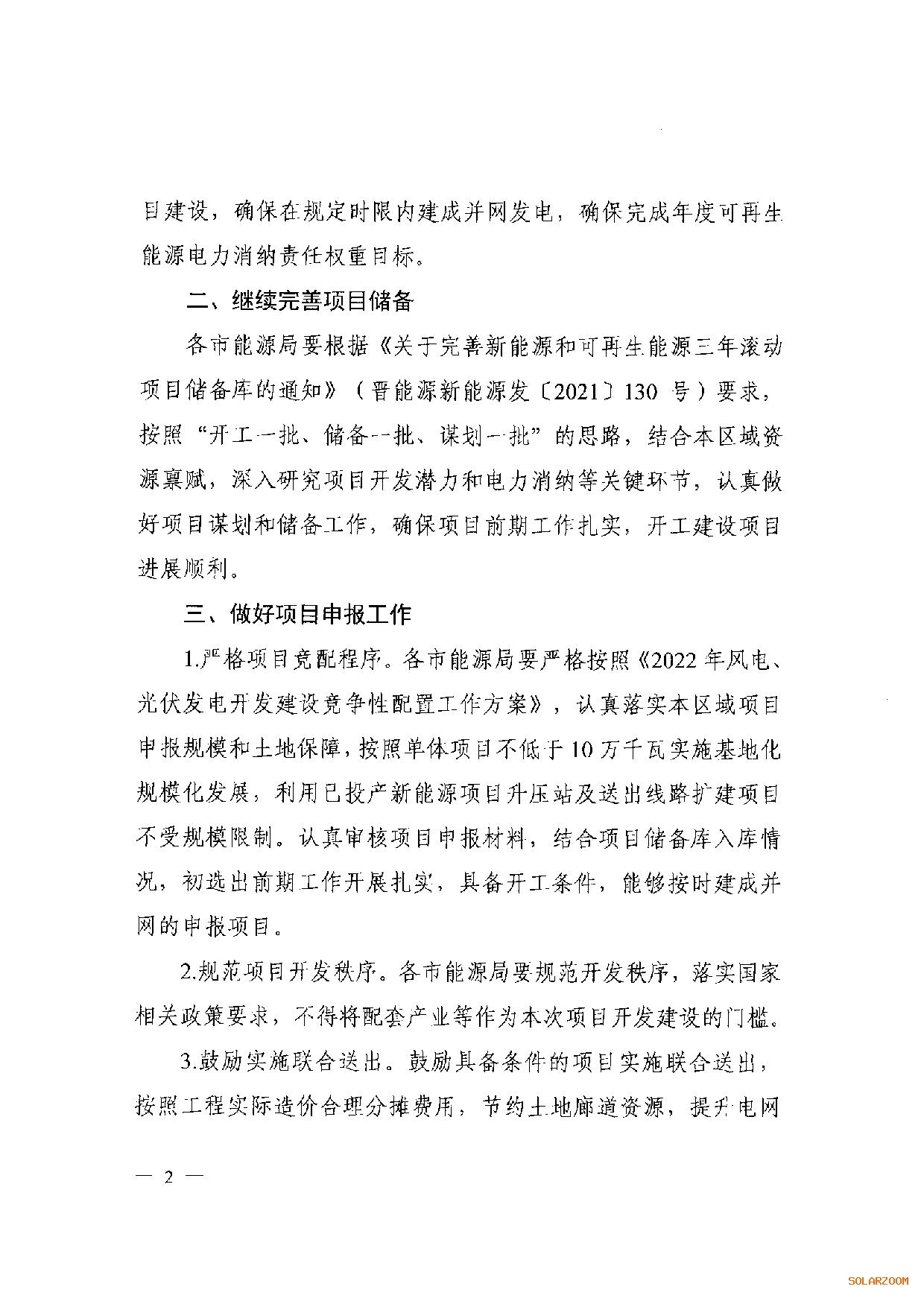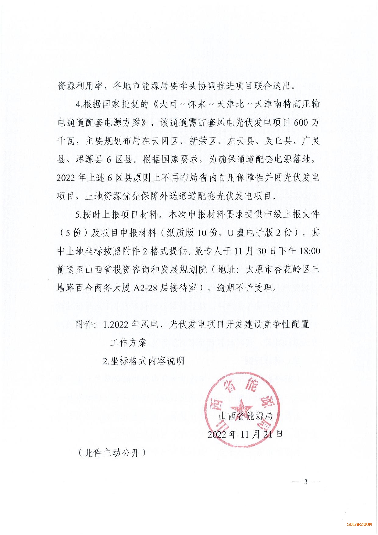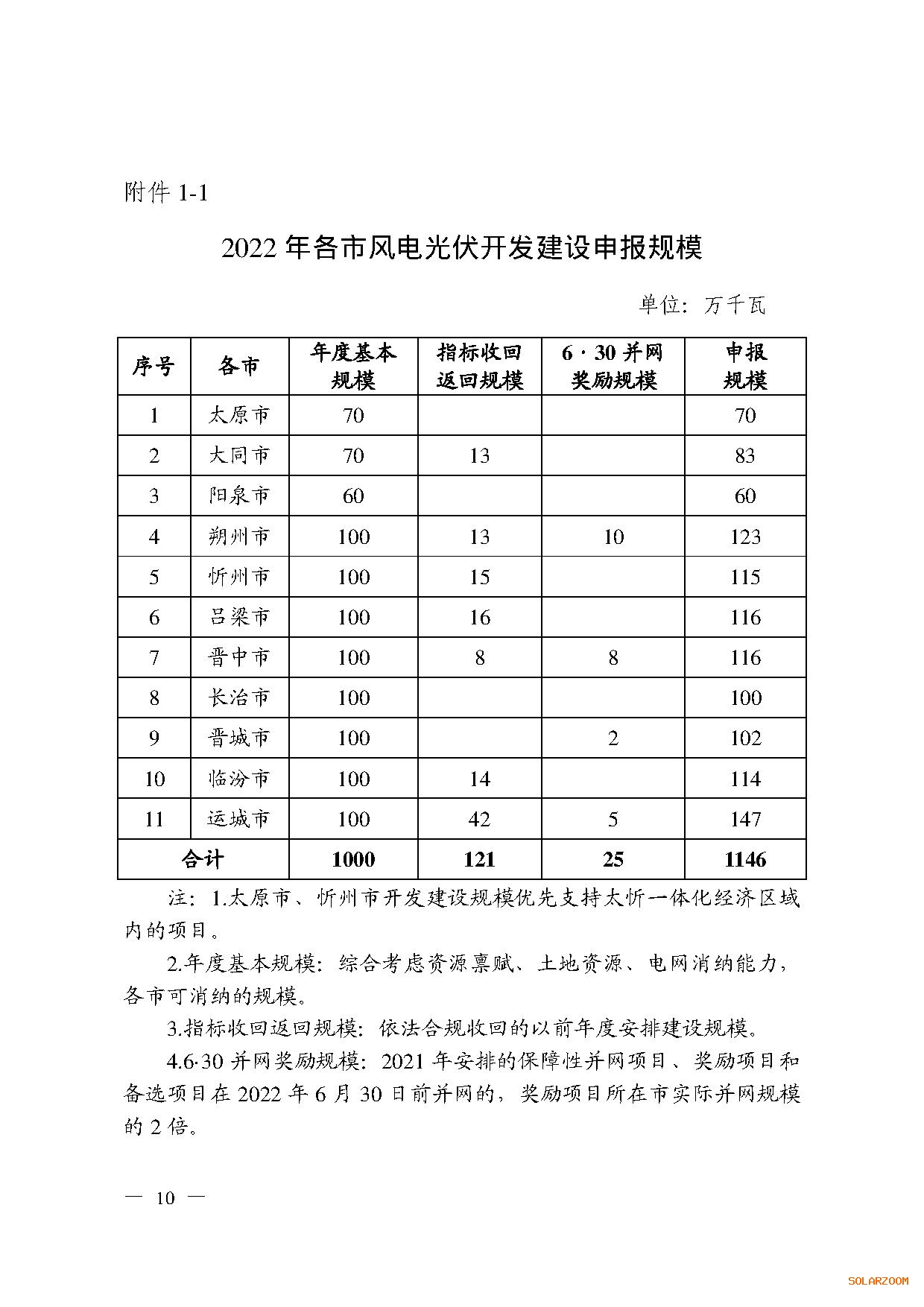 11月21日,山西省能源局印發(fā)《關于做好2022年風電、光伏發(fā)電開發(fā)建設競爭先配置有關事項的通知》,通知提到,為確保完成省十二次黨代會確定目標任務,結合風電、光伏發(fā)電項目儲備工作,綜合考慮全省全社會用電量、外送電量、電網消納能力、可再生能源消納責任權重目標等因素,安排風電、 光伏保障性并網年度規(guī)模 1000 萬千瓦,獎勵規(guī)模 146 萬千瓦。