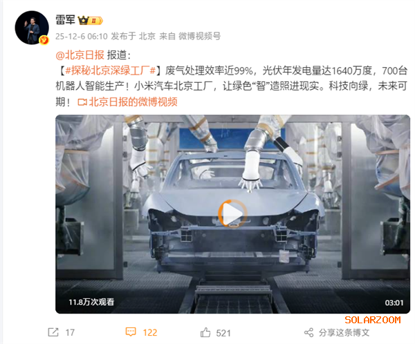 小米創(chuàng)辦人,董事長(zhǎng)兼CEO雷軍今天一大早就轉(zhuǎn)發(fā)了北京日?qǐng)?bào)的報(bào)道,其探訪了小米汽車工廠,向大家展示了工廠的綠色環(huán)保和智能生產(chǎn)。