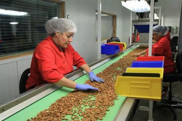 ▲資料圖片:工人在美國(guó)加州巴旦木加工廠內(nèi)工作。加州巴旦木種植業(yè)農(nóng)民期待中美早日消除貿(mào)易摩擦。(新華社)
